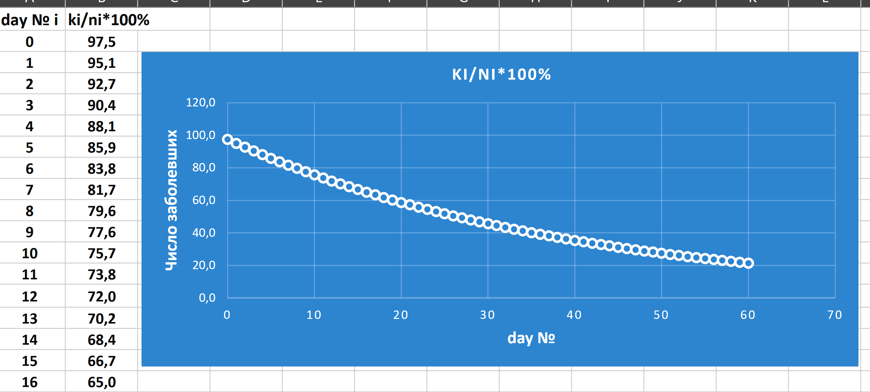 В анализируемый период времени (сезон, волна эпидемии) ni – число новых заражений (заболевших людей) в произвольные i-е сутки, n0 – число новых заражений в сутки накануне расчетного периода. Нас интересует оценка числа заражений в сутки в будущем, например, через месяц, n30.