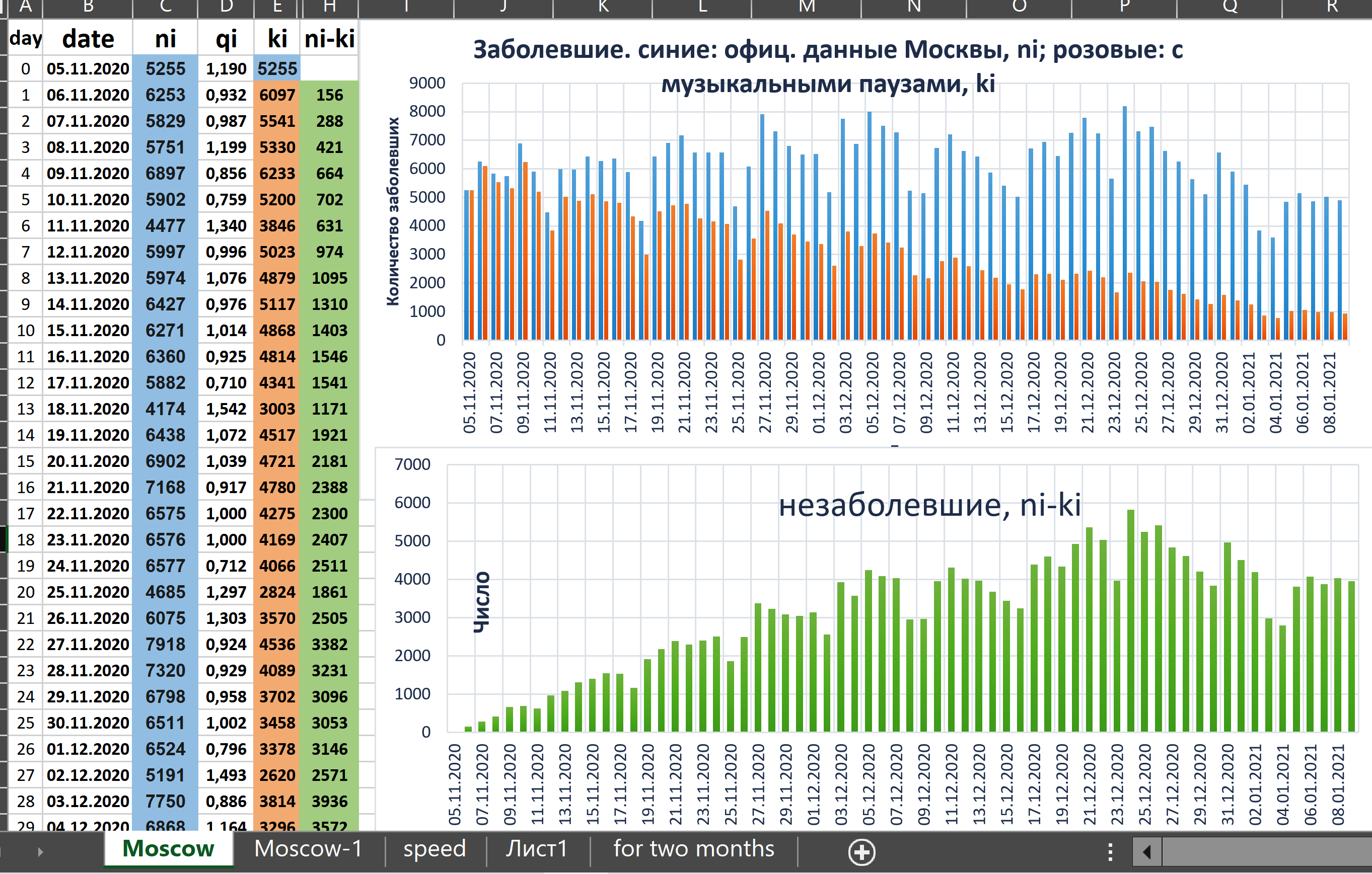 ni — число заболевших, официальные данные Москвы; ki — число заболевших, если делается ежедневная музыкальная пауза 1 час. Зелёные — незаболевшие благодаря музыкальным паузам, ni - ki . α=0,5 .